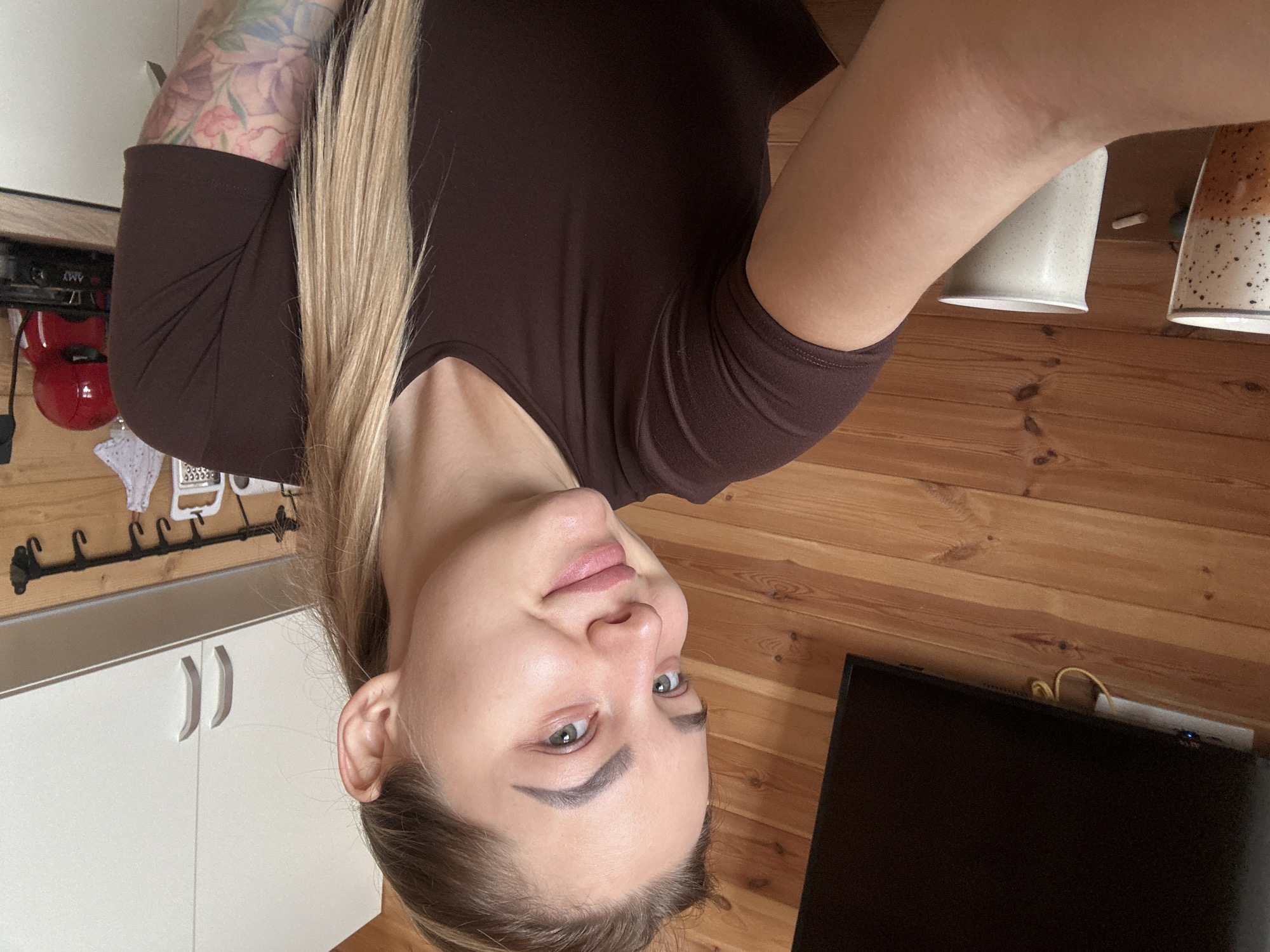 The scene is set indoors, within a location specified as Доња Брезна, Montenegro. **Subject:** A female individual is centrally positioned, facing the camera with a subtle smile. She has light skin, light-colored eyes, and light brown or blonde hair styled in a ponytail. Her eyebrows exhibit evidence of permanent cosmetic enhancement. She is wearing a dark brown, short-sleeved top with a V-neck. A floral tattoo is visible on her left forearm/bicep, partially extending from her sleeve. Her right arm and elbow are partially visible on the right side of the image. **Foreground/Midground Objects:** On a dark surface in the lower left, two ceramic mugs are present: one with a speckled white and orange/brown pattern, and another plain off-white. Between these mugs, a small, white cylindrical object rests. **Background Environment:** The walls in the background are constructed of horizontal light brown wooden planks. To the left, a large, black flat-screen television is mounted on the wooden wall. Below the television, a white power strip with a blue indicator light and a coiled yellow cable are visible against the wooden surface. To the right, white upper kitchen cabinets with two silver, curved handles are visible. Below these cabinets, a black metal rod with multiple hooks is mounted on the wooden wall. Hanging from these hooks are various kitchen items, including a white grater and a white patterned cloth. On a light-colored countertop beneath the hooks, a red appliance, consistent with a single-serve coffee machine, is present next to a smaller black appliance with partially legible text that reads "AMY". **Actions/Interactions:** The female subject is actively engaged in a self-portrait, looking directly at the camera.