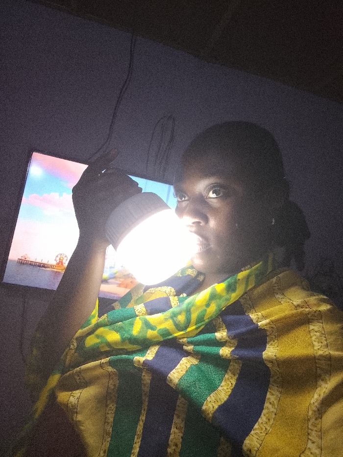 In a dark room, a woman holds a bright, cylindrical light close to her face, illuminating her features. She looks upwards, away from the camera. Behind her, a television screen displays a beach scene with a pier. The woman is draped in a yellow, blue, and green patterned fabric. The lighting is harsh, obscuring much of the background and emphasizing the contrast between light and shadow. A wire hangs down from the ceiling above the television.