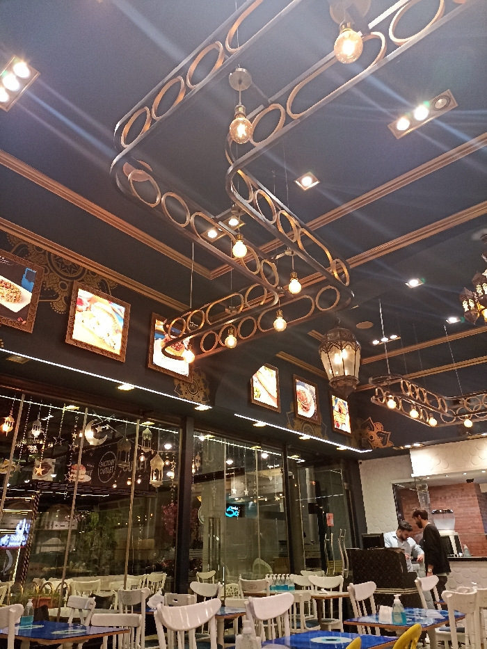 The image depicts the interior of a commercial establishment, likely a cafe or restaurant, located within Kafr Sousa Municipality, Syria. The ceiling is dark blue, accented with gold trim and recessed lighting, and features an elaborate, curving black metal chandelier with repeated oval cutouts, from which multiple exposed filament light bulbs are suspended. A large, ornate Moroccan-style lantern with frosted panels hangs prominently to the right. The walls are also dark blue with gold decorative borders and subtle patterns, displaying several backlit rectangular frames showcasing images of food items. The foreground and mid-ground reveal a dining area furnished with numerous small tables, many with blue or white tops, surrounded by white chairs featuring distinctive backrests. A glass partition, adorned with string lights, crescent moon, star, and lantern decorations, separates the primary seating area from another section or exterior space. A sign reading "FACTORY OUTLET" is visible through this glass. In the background, two adult males are standing near a service counter. One individual wears a light-colored collared shirt, and the other wears a dark long-sleeved shirt. Behind the counter, an exposed reddish-brown brick wall texture is visible, along with a beverage dispenser. The overall lighting is bright, contributing to a modern yet traditionally accented aesthetic.