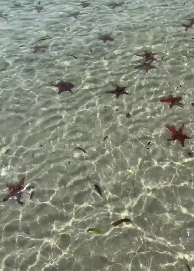 shallow sandy seafloor, covered with numerous red starfish, each with five arms