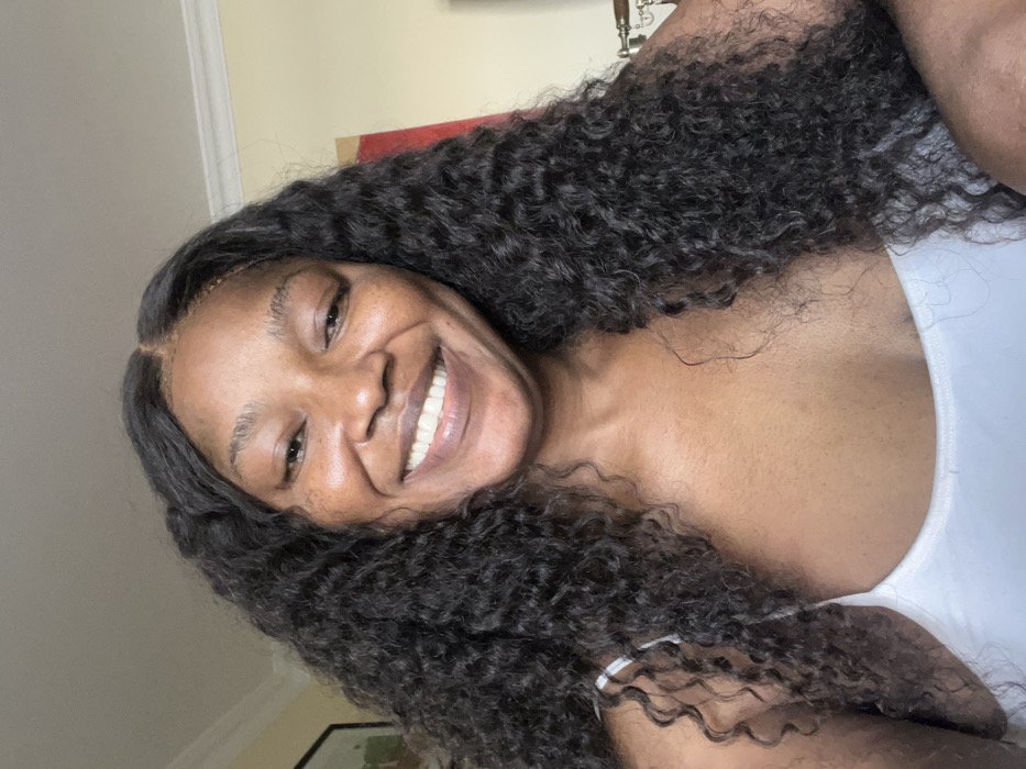 The image depicts a woman with brown skin and long, dark, curly hair, parted near the crown