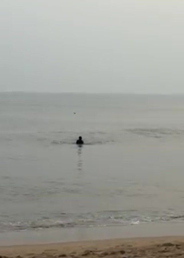 The scene is a static shot of a beach with a person swimming in the ocean. The beach has light brown sand. The ocean is calm, with small waves breaking on the shore. The water is a muted gray-blue color. A single person is visible in the water, their silhouette stark against the lighter horizon. The person is swimming some distance from the shore. The sky is overcast and gray, contributing to the somewhat bleak and subdued atmosphere of the scene. In the background a buoy can be seen.