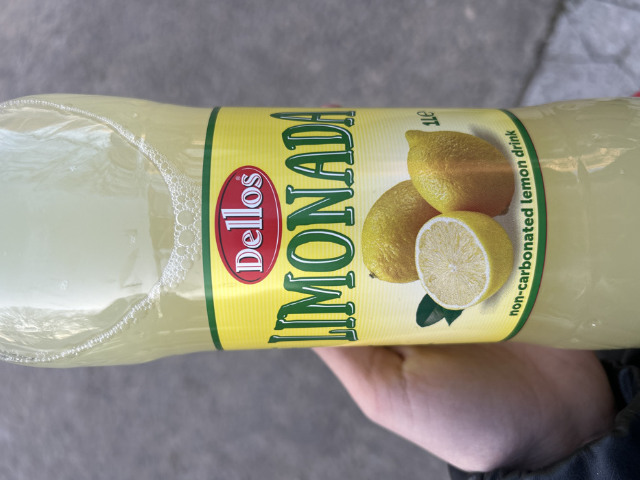 The image displays a close-up, eye-level shot of a clear plastic bottle held by a human hand, set against a blurred grey background. The bottle contains a pale yellow liquid with a foam layer at the surface. The label is yellow, featuring a red oval "Dellos" logo, large green text reading "LIMONADA", and an illustration of three lemons, one cut in half. Below the lemons, green text states "non-carbonated lemon drink." The volume "1Le" is also visible. A light-skinned left human hand grasps the bottle from the left side, with the thumb prominently displayed. A dark sleeve covers part of the wrist. The blurred background appears to be a grey, textured surface, indicative of concrete or pavement. The location is the city of Unknown, Unknown.