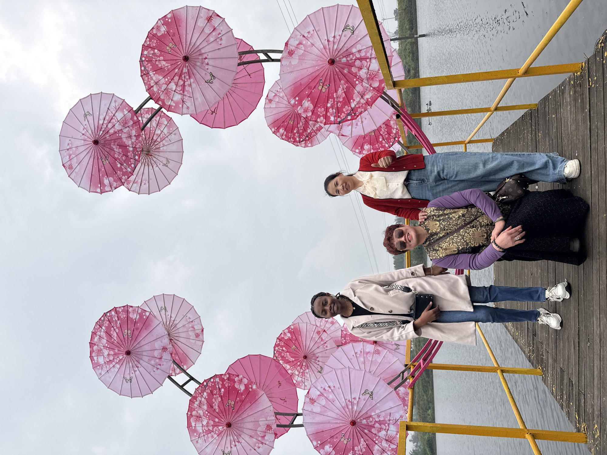 Four women are standing on a wooden deck beside a body of water. The deck has a yellow railing. Suspended above the deck are pink umbrellas. The sky is overcast. The location is Xianfeng, China. One woman is wearing a white shirt and red cardigan and light wash jeans. Another woman is wearing a gold and black vest with a purple long-sleeved shirt, and is also wearing black sunglasses. A third woman is wearing a light-colored coat and jeans. The fourth woman is partially obscured by the third woman, but is wearing black.