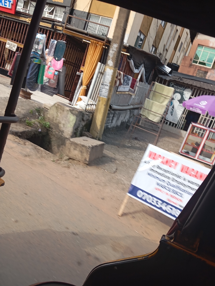 A tilted street view showcases a "Vacancy Vacant" sign, indicating job openings with specific qualifications and contact information. The scene is partially obstructed by the vehicle's frame and a utility pole. Shops are visible in the background, with items displayed for sale, and buildings of varying heights form the backdrop. The street pavement and surrounding concrete structures complete the urban landscape.