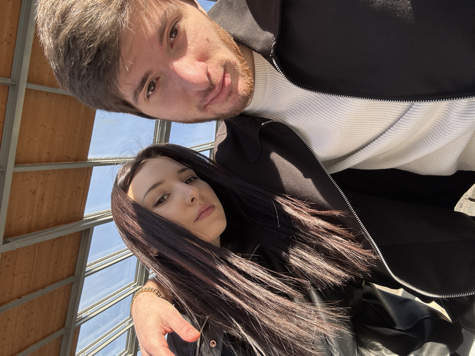 A close-up image captures two individuals, one female and one male, in an outdoor or semi-enclosed setting in Alfortville, France, under a skylight structure. Both subjects are looking directly at the camera. The female, positioned on the left, has long, dark brown hair and is wearing a dark top or jacket. Dark eyeliner is visible, and a gold-colored chain bracelet adorns her left wrist. Her left forearm and hand are partially visible in the upper left of the frame. The male, positioned on the right, has short, dark brown hair and light facial stubble. He is wearing a light-colored, possibly off-white, ribbed turtleneck sweater underneath a dark, collared jacket that is partially unzipped. The background reveals a structural roof system composed of light-colored wooden beams or panels and a metal framework, with clear glass panes allowing views of a bright blue sky. Sunlight illuminates the scene from above, casting shadows on the subjects' clothing and hair.