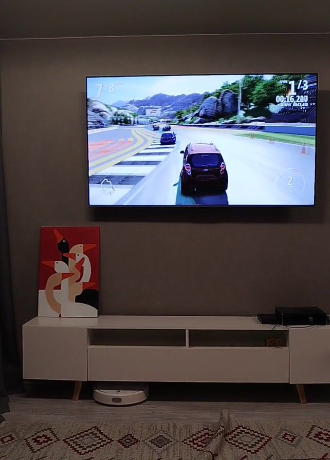 A video shows a TV mounted on a gray wall above a white console table. On the console table, from left to right, there is an abstract painting of three birds, a white round robot vacuum cleaner, and a black video game console. On the TV is a racing game where a red car is in third place of eight total racers on a road going uphill. On the floor in front of the console table is a gray couch on top of a patterned rug. To the left of the console table are gray curtains.