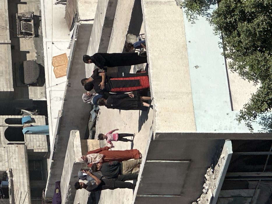 - "An overhead image depicts a group of approximately ten individuals gathered on a flat, sunlit concrete rooftop in Khan Yunis, Palestinian Territory" by FM-zF1RI3, licensed under CC BY 4.0