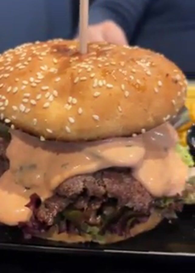 A close-up shot shows a sesame seed hamburger with a toothpick through the top bun. The hamburger includes lettuce, a meat patty, and a creamy orange sauce on a black plate. French fries and a small black container of white sauce appear to the right of the burger. An unidentified person wearing a blue long-sleeved shirt sits at the table.