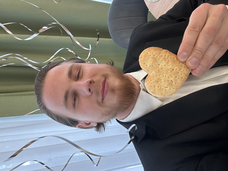 A male subject, estimated to be in his 20s or early 30s, is depicted indoors in Старт-2 Снт, Russia. He has light brown hair styled back and a light brown beard and mustache. He is wearing a black suit jacket over a light-colored collared shirt. The subject is holding a heart-shaped, light golden-brown biscuit with visible perforations in his right hand, extended towards the viewer. A small crumb or smudge is present on his lower lip. He is looking directly at the camera with a slight smile. The background features silver, curly decorative streamers, indicating a celebratory setting. To the left, a light-colored sheer curtain is visible, and to the right, a darker green curtain. A dark gray upholstered chair and the edge of a light-colored table are partially visible on the right side of the frame.