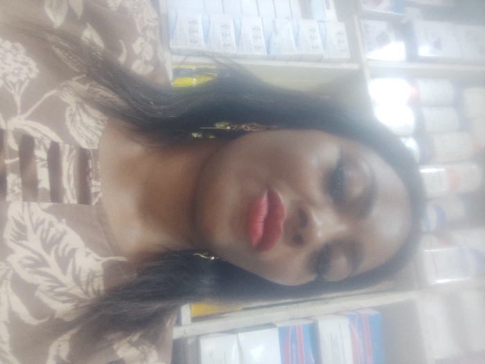 A medium-shot portrait captures a single adult female in an indoor setting in Maiburiji, Nigeria. The woman, exhibiting a dark skin tone and long, straight dark hair, is positioned centrally, facing the camera with her head slightly tilted upwards. Her eyes are closed or heavily lidded, and her lips are pursed, accentuated by red lipstick. She wears a light brown top with a darker floral or leaf pattern and a horizontal striped detail at the neckline. Long, dangling gold-toned earrings are visible on both sides of her face. The background consists of light-colored shelving units stocked with various packaged items, including white boxes on the left, blue and white boxes on the right, and multiple round containers on the upper shelves, suggesting a retail or storage environment. The lighting is bright, causing some blurring in the background.