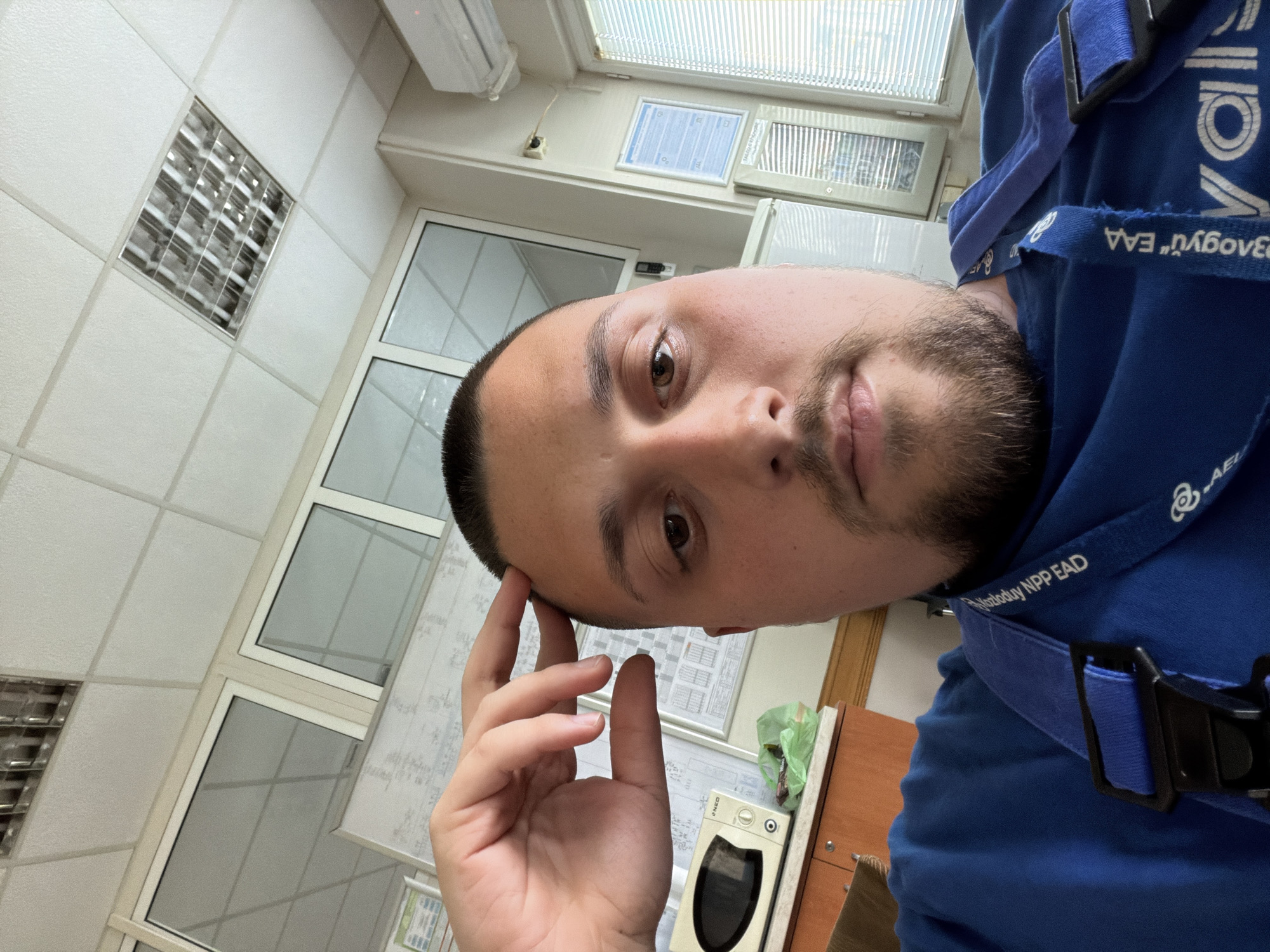 A male individual with short dark hair, a light beard, and brown eyes is captured in a selfie-style photograph. He wears a blue t-shirt and blue overalls or harness straps. A blue lanyard around his neck features the text "Kozloduy NPP EAD" in both Cyrillic and Latin script, along with a corporate logo, identifying his affiliation with the Kozloduy Nuclear Power Plant. His left hand is positioned with fingers slightly bent, resting near his right temple. The background indicates an indoor environment, likely an office or breakroom. A white drop ceiling with a recessed fluorescent light fixture is visible overhead. To the left, a white microwave oven is situated on a wooden countertop, beside a light green plastic bag. A framed document or diagram is mounted on the wall behind these items. To the right, an air conditioning unit is fixed high on the wall, below which a small wall-mounted sensor and framed informational posters are visible. A window with white venetian blinds is also present on the right side. The overall scene suggests an interior space within the Kozloduy Nuclear Power Plant in Kozloduy, Bulgaria.