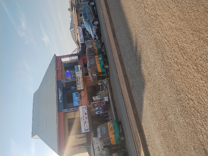A multi-story building with shops is located on a street. The building has a gray roof, a red facade, and multiple signs. Several three-wheeled vehicles are parked along the street, alongside a parked car. A large sandy or gravelly area extends from the edge of the street. The sky is blue with some clouds.