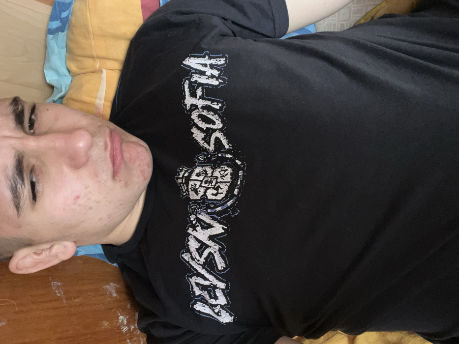The image displays a single male individual, appearing to be a young adult, captured from the upper chest upwards while reclining in an unidentified indoor location. He possesses fair skin exhibiting multiple blemishes, short-cropped hair on the sides, thick eyebrows, and a broad nose. His facial expression presents a slight pout with a downturned mouth and narrowed eyes, looking directly towards the camera. He is dressed in a black short-sleeved t-shirt featuring a distressed white graphic print across the chest that states "LEVSKI SOFIA," separated by a white and blue crest emblem. To the left of the individual's head, a light brown wooden surface is visible. To the right and below the individual, patterned bedding or fabric in blue, yellow, and potentially white tones is present.