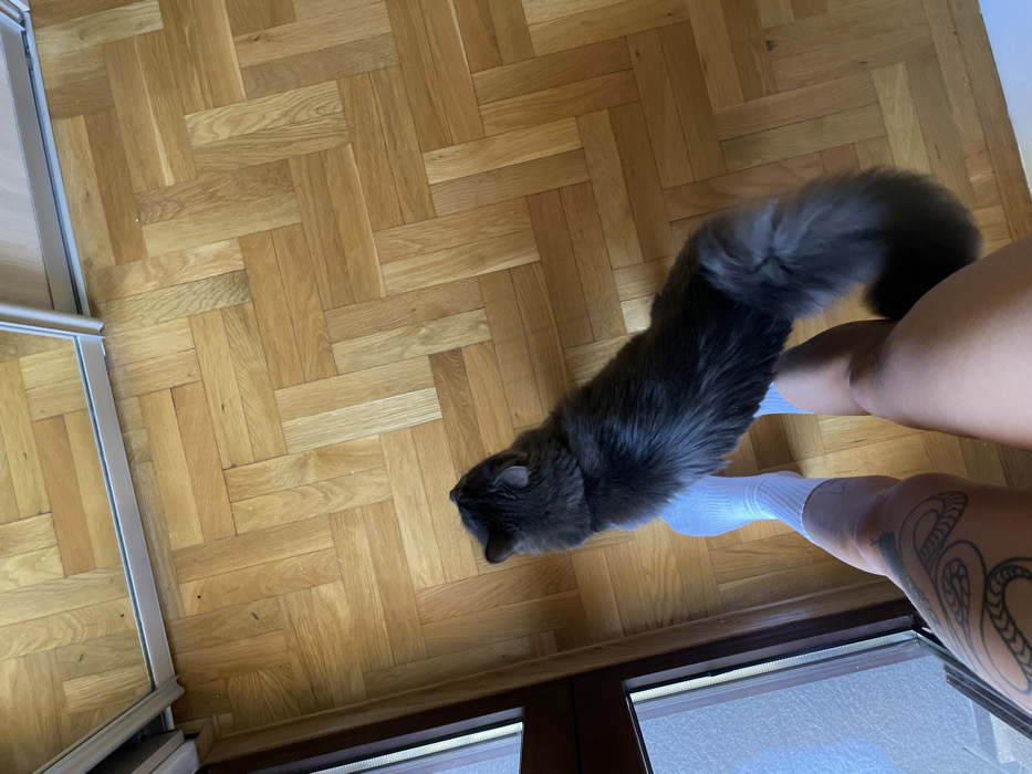 - "An overhead indoor shot taken in Boreti, Montenegro, depicts a long-haired, dark gray cat positioned between the legs of a person standing on a light-colored wooden parquet floor, laid in a herringbone pattern" by FM-GgSpJ3, licensed under CC BY 4.0