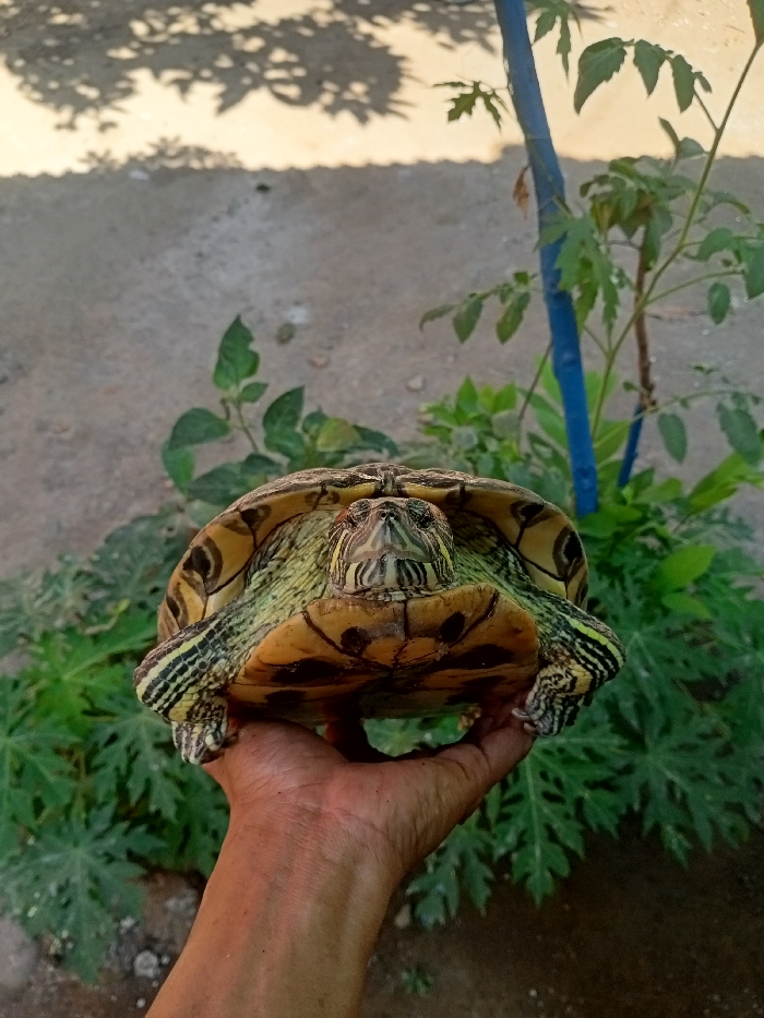 A Red-eared Slider turtle, identifiable by its patterned green and yellow skin, striped limbs, and red patches behind its eyes, is held by a human hand in Ketowan, Indonesia. The turtle is positioned face-forward, supported from beneath its plastron by an open palm. The background consists of a light-colored, possibly concrete or compacted dirt, surface upon which dappled shadows from overhead foliage are cast. Various green plants are visible, including broad-leaved types in the lower background and taller, slender plants on the right, one of which is supported by a thin blue pole. The scene is illuminated by strong natural light, producing defined shadows.