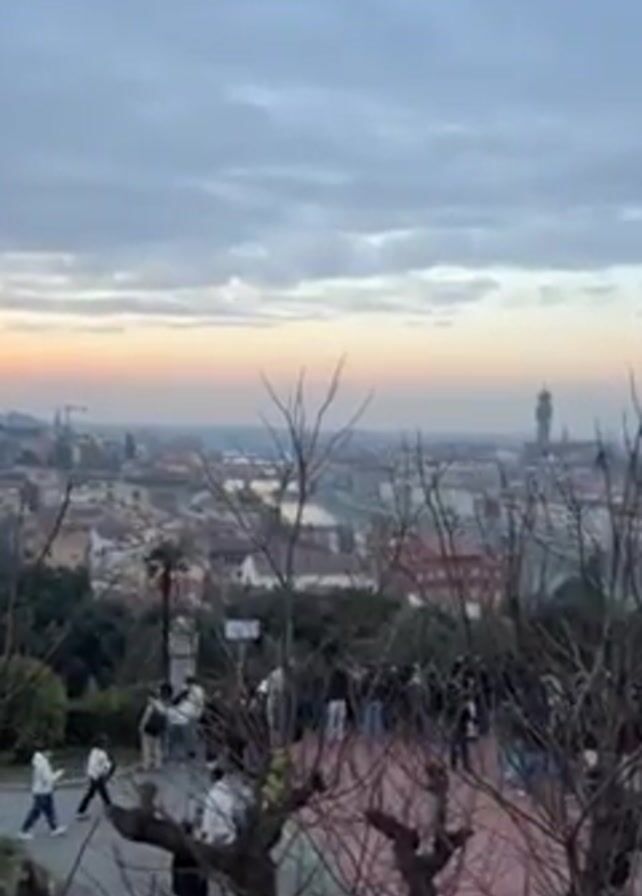 cityscape, presumably in Europe, viewed from a high vantage point. A river runs through the city, spanned by several bridges. Buildings are densely packed, and a tall tower or dome can be seen in the distance. The sky is overcast with hints of a sunset. In the foreground, there are bare trees and a paved area with a crowd of people. They seem to be looking at the view.