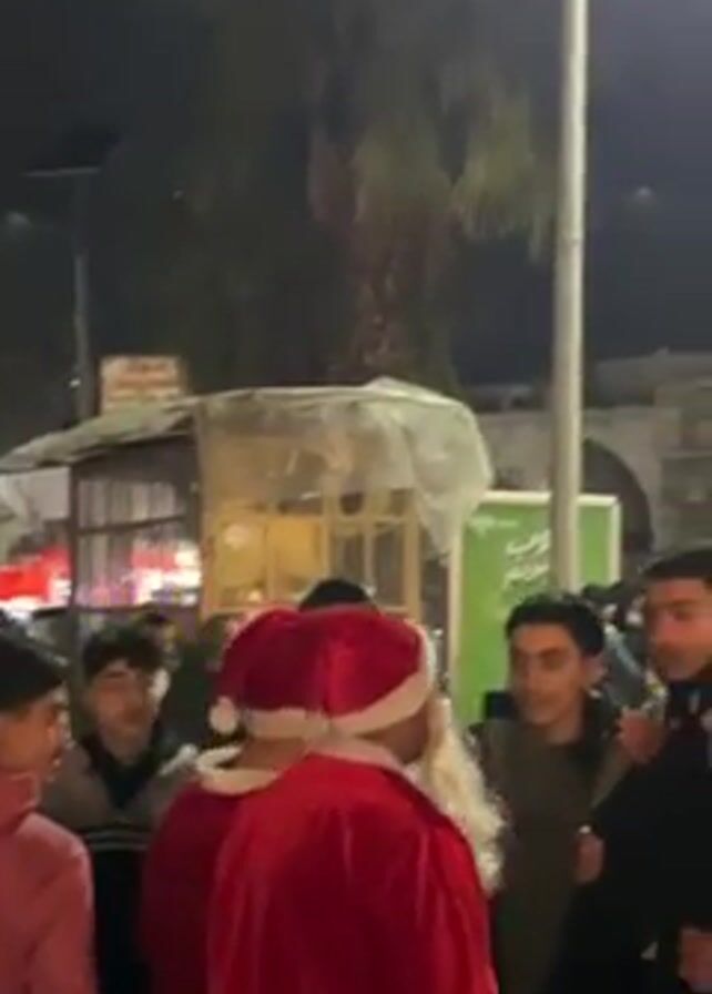 group of people, several dressed as Santa Claus, gathered outside at night. The people are interacting and chatting in a casual manner. There is a security booth nearby. In the background, buildings and streetlights are visible. It seems to be a public celebration of some kind.