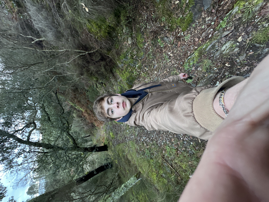 A young person is taking a selfie in a wooded area. They are wearing a brown jacket with blue trim. Trees and mossy ground surround them. A silver bracelet is visible on their wrist. Part of their hand is in the foreground, slightly obscuring the view.