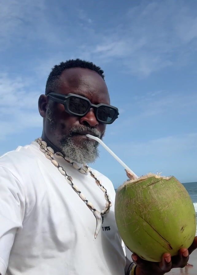 A man is drinking from a coconut on a beach. He is standing in the sand, holding the coconut in his right hand. He is wearing a white t-shirt, black sunglasses, and a necklace made of shells. The coconut is green and has a white straw inserted into it. The ocean is visible in the background, with gentle waves coming to shore. There are palm trees and other people in the background as well. The sky is blue with some scattered clouds. The man appears relaxed and is enjoying the drink.