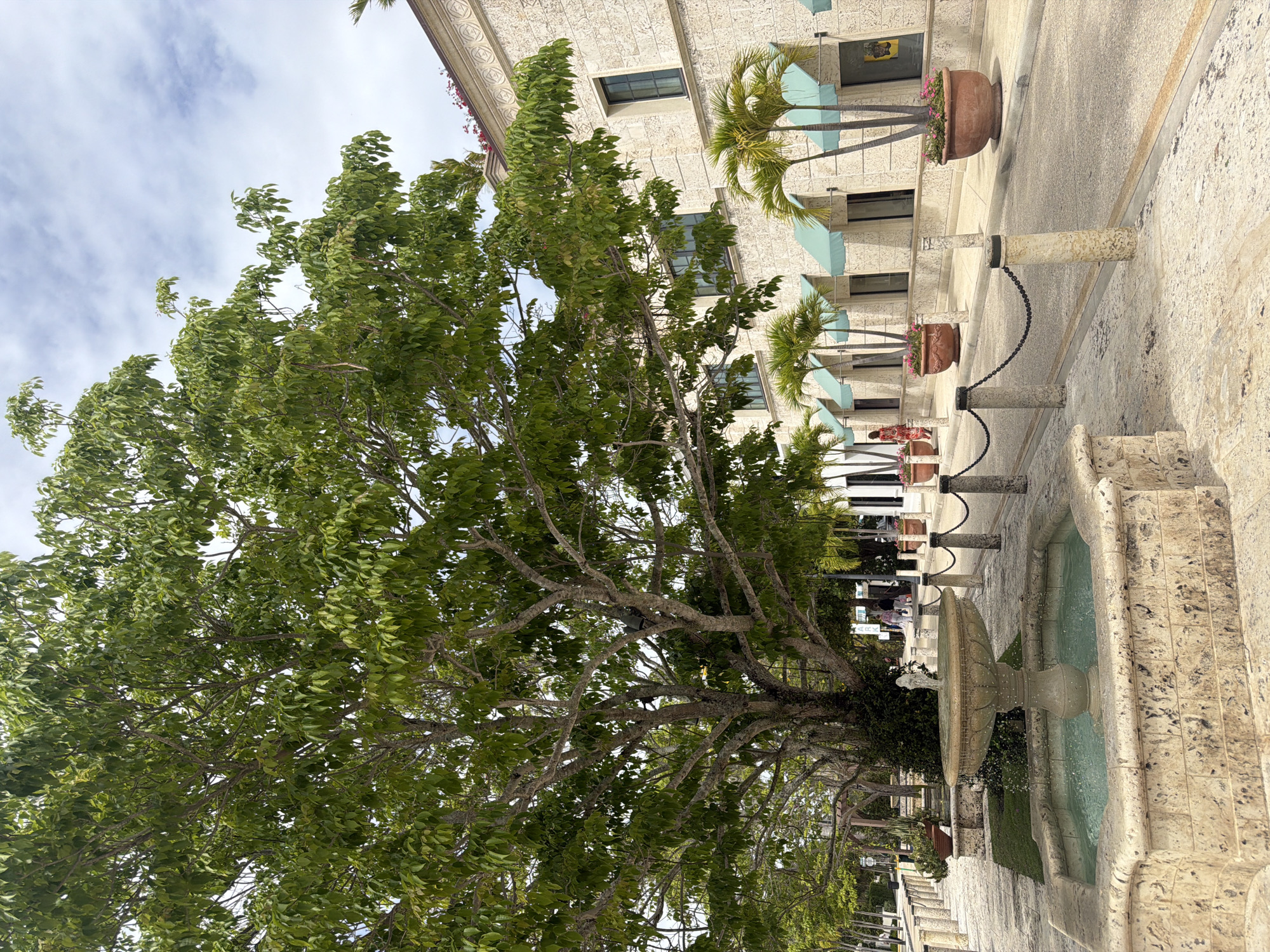The image captures a picturesque scene in Palm Beach, Florida, USA. A large, mature tree dominates the foreground, its extensive branches and dense green foliage filling a significant portion of the frame. Behind the tree, a building with an ornate facade is visible, featuring windows and decorative details. Along the walkway, there are potted plants and small palm trees, adding to the tropical ambiance. A fountain is situated to the right of the frame, its stone structure providing a textured contrast to the greenery. People are walking in the background. The scene is typical of the upscale environment of Palm Beach.