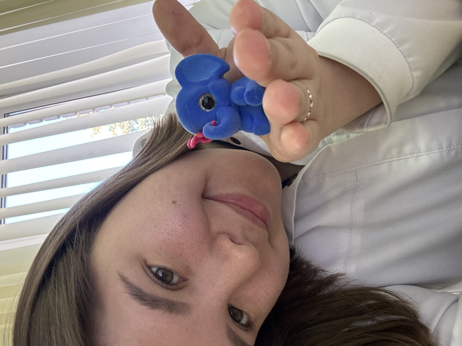 A young adult female is visible in an indoor setting in Kazan, Russia. She has light brown hair, brown eyes, and a fair complexion with freckles, and is smiling towards the camera. She wears a white lab coat, with a darker garment visible underneath at the neckline. Her left hand, adorned with a thin silver ring on the ring finger, is extended, holding a small blue, velvety elephant figurine. The figurine features large black glitter eyes and a pink, coiled trunk. In the background, a window with white vertical blinds is partially visible. Blurred green-yellow foliage is faintly discernible outside the window.