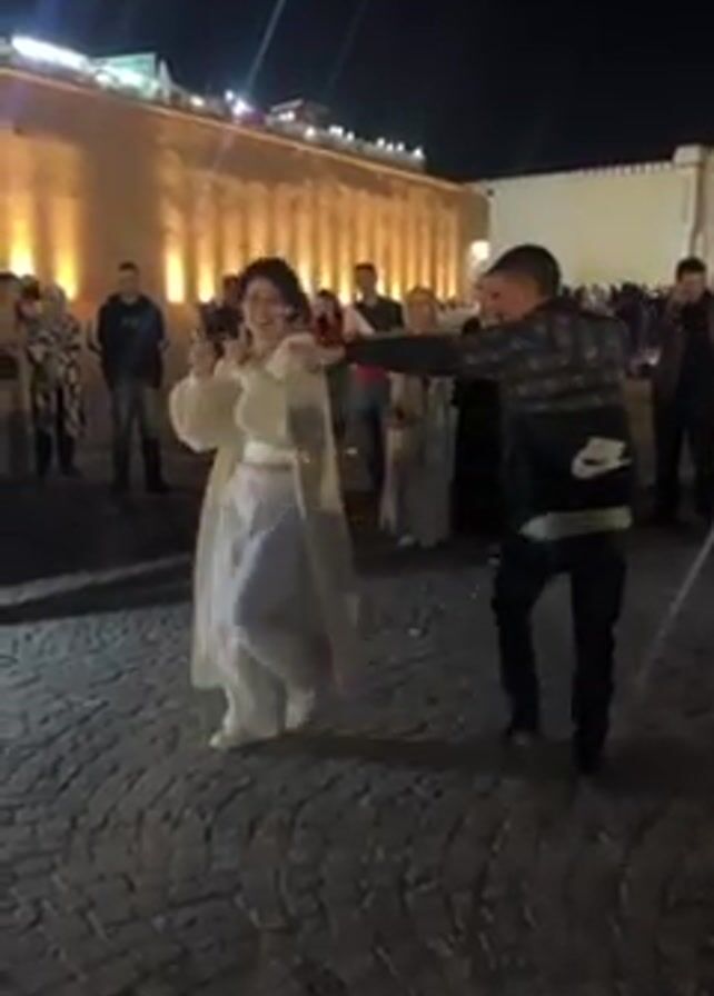 A woman and a man are dancing in a plaza at night. The woman is wearing white pants, a white top, and a white sweater. The man is wearing dark pants and a dark jacket with a Nike logo on it. The plaza is paved with cobblestones and there are many people in the background. There is a large, lit building behind them. The woman makes a peace sign with her fingers and seems to be enjoying herself. They are dancing and laughing.