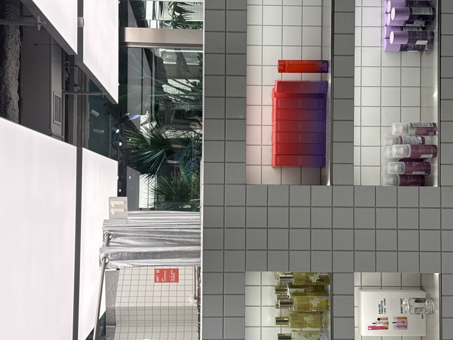 The image features a tiled wall with built-in shelves displaying beauty products. One shelf holds gradient red-to-purple lipsticks, another has purple lip glosses and pink mini-lotions, and another features yellow-toned floral-scented body sprays. A bottom shelf shows a white box with product images and prices, next to a glass roller-ball perfume. A partial view of a store exterior includes glass and tropical plants. A privacy screen of white curtains hangs near a tiled wall with a red sign.