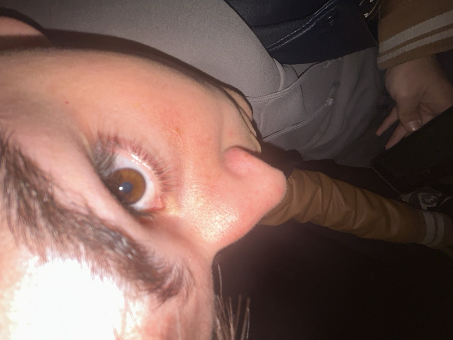 A close-up, high-angle photograph depicts a human subject, likely male, from the perspective of looking down. The central focus is the subject's right eye, which is brown with a visible pupil and clear reflections from a direct light source. The right eyebrow is dark and thick. The bridge and tip of the nose are visible, along with parts of the forehead and right cheek, exhibiting a light skin tone with some reddish areas. The subject is wearing a light grey hooded sweatshirt, visible on the torso. The left arm is clad in a tan/brown jacket with horizontally striped cuffs (light and dark brown). A dark, possibly black, jacket is partially visible on the right side of the frame, over the grey sweatshirt. In the lower right, the subject's right hand is making a peace sign gesture (index and middle fingers extended) while holding a black smartphone. A bright, intense light source is evident in the upper left quadrant, illuminating the subject's forehead and casting a strong highlight on the upper part of the eye. The immediate background is dark and featureless, providing no environmental context. There are no discernible visual cues within the image to identify a specific location in Yambol, Bulgaria.