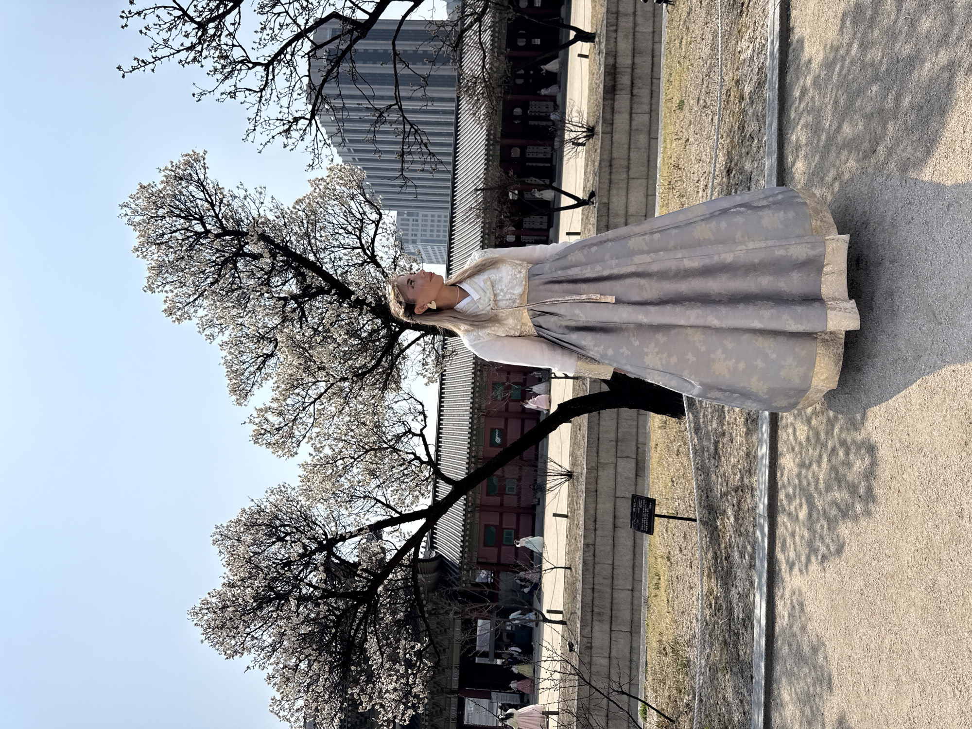The image displays an adult female with long blonde hair, partially styled in an updo, wearing gold triangular earrings. She is dressed in a traditional Korean Hanbok, featuring a white jeogori (top) with subtle gold patterns and a full-length grey chima (skirt) adorned with similar patterns and a gold trim at the hem. She stands on a light-colored gravel path, positioned slightly right of center, looking upwards and to her left, with her shadow cast to her right. The scene is set within the Gyeongbokgung Palace complex in Seoul, South Korea. In the midground, several trees with white blossoms, likely cherry or plum, are visible, their dark branches prominent. Behind these trees, traditional Korean palace buildings with distinctive red wooden walls and dark tiled roofs are present. A low, grey stone wall and an area of dry grass separate the foreground from these structures. Multiple other individuals, predominantly females wearing various colorful Hanboks, are observed walking or standing within the palace grounds in the background. Beyond the historical architecture, modern high-rise buildings with glass facades are visible, contrasting with the traditional setting. The sky is clear and light blue, indicating bright daylight conditions.