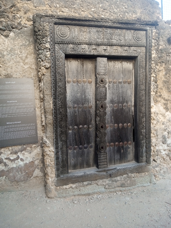 A weathered, intricately carved double wooden door stands centrally, set into a rough, light-colored stone wall. The door panels are dark, aged wood, exhibiting numerous round, dark metal bosses arranged in six horizontal rows on each panel. The door frame is elaborately carved: the upper lintel features a central band of Arabic calligraphy, flanked by circular rosette motifs and a lower frieze of stylized bird-like figures. The vertical jambs are adorned with continuous intertwined floral or geometric patterns. The central vertical meeting point of the two door panels is similarly carved with stacked rectangular and circular elements. To the immediate left of the door, a dark gray rectangular informational plaque is affixed to the stone wall. Visible text includes "الأبواب العُمانية," "Omani Doors," and "Milango ya Kiomani," with additional descriptive paragraphs below. The stone wall itself displays a rough, uneven texture, characteristic of coral rag masonry, with visible mortar and some erosion. The ground immediately in front of the door consists of light-colored, compacted earth or sand containing small stones. The scene is static, devoid of people or discernible movement. This architectural feature is located within the Mji Wa Kale (Old Town) area, part of the Makadara ward in Mombasa, Kenya.