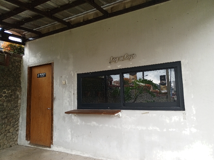 This image depicts the exterior facade of a building identified as "Log in Cafe" in Voa Yeav, Cambodia. The primary structure features a light-colored, possibly stuccoed or painted concrete wall displaying signs of weathering and discoloration. Overhanging this section is a corrugated metal roof supported by dark metal beams. To the left, a vertical, dark-stained wooden door with a silver-colored handle is present. A rectangular black sign is affixed to the door, partially legible, displaying "NO DURATION PARKING" and the number "45". Adjacent to the door, a wall constructed from irregular natural stones is visible. To the right of the door, a large, rectangular window with a dark-colored frame is prominent. Below the window, a narrow, horizontal wooden shelf extends outwards from the wall. Above the window, the phrase "Log in Cafe" is affixed to the wall in a light-colored, cursive script. The window's glass reflects an outdoor scene, including a white sign displaying "CLOSED", a sign with a coffee cup logo, green foliage, a stone wall structure, and an overcast sky. A small, light-colored rectangular object, possibly a light switch or electrical outlet cover, is visible on the wall between the door and the window. The ground in the foreground is a concrete slab. No individuals are present in the scene.