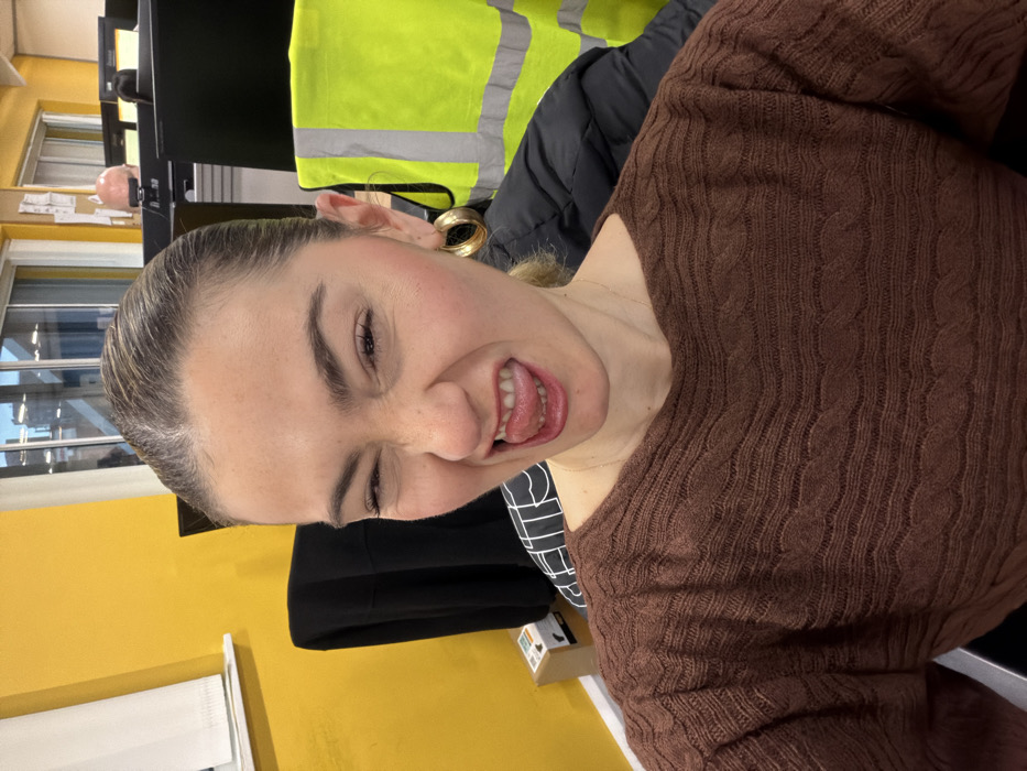 An indoor office environment in Manchester, United Kingdom. A female, with light skin and dark hair pulled back, occupies the foreground. She wears a brown cable-knit sweater and gold-colored hoop earrings. Her facial expression is playful, characterized by squinted eyes, an extended tongue, and a slightly curled upper lip revealing some upper teeth. Freckles are visible on her nose. The background on the left features a bright yellow wall, a window with a white blind, a draped dark garment, and a small cardboard box. To the right, office workstations with dark computer monitors are visible, alongside a bright yellow high-visibility vest with reflective silver stripes draped over an object. A pink object is discernible on a desk further back.