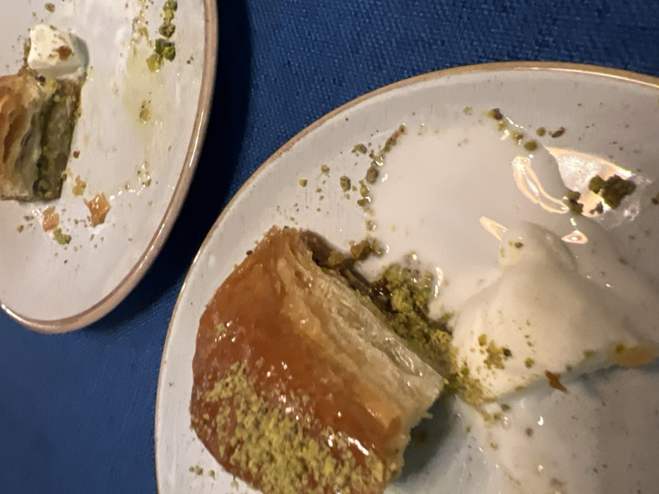 The image depicts a close-up view of two light-colored ceramic plates resting on a dark blue, textured fabric surface. The scene is located in Bağcılar, Turkey. In the foreground, a single, approximately 8x6 cm piece of baklava is centered on a plate, featuring golden-brown flaky layers, a glossy syrup coating, and a generous topping of green crushed pistachios. Adjacent to the baklava, a melting quantity of white cream or ice cream is visible, intermingled with pistachio fragments and syrup residue. The plate itself shows scattered green pistachio remnants and clear liquid residue. In the upper right background, a second, partially visible plate holds a smaller, partially consumed piece of baklava, also exhibiting a golden-brown appearance, syrup, and green crushed pistachios. This plate also contains a small amount of melting white cream or ice cream and scattered pistachio fragments. No individuals or direct actions are visible; the scene presents the aftermath or an paused state of dessert consumption.