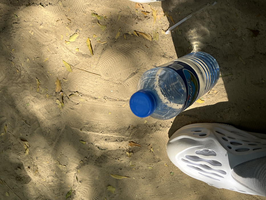 The image displays an outdoor ground-level scene, characteristic of Maiduguri, Nigeria. The ground consists of light brown sand or dirt, scattered with dry, yellow-brown leaves. Strong sunlight casts distinct shadows, suggesting an open area with some overhead foliage. Visible impressions, possibly from footwear or small tires, are present in the sandy surface. In the center-right, a clear plastic water bottle, approximately half-liter in size, stands upright, filled with clear liquid and capped with a blue screw-top. Its label is partially visible, displaying "SWAN" with blue and green graphics. To the left, the front section of a white, open-work shoe, identified as a Yeezy Foam Runner style, is visible, worn over a light grey sock. A thin, white, plastic stick-like object, resembling a cable tie or straw, lies on the ground to the right of the water bottle. No individuals are directly visible, but the presence of the shoe implies a person's immediate proximity.