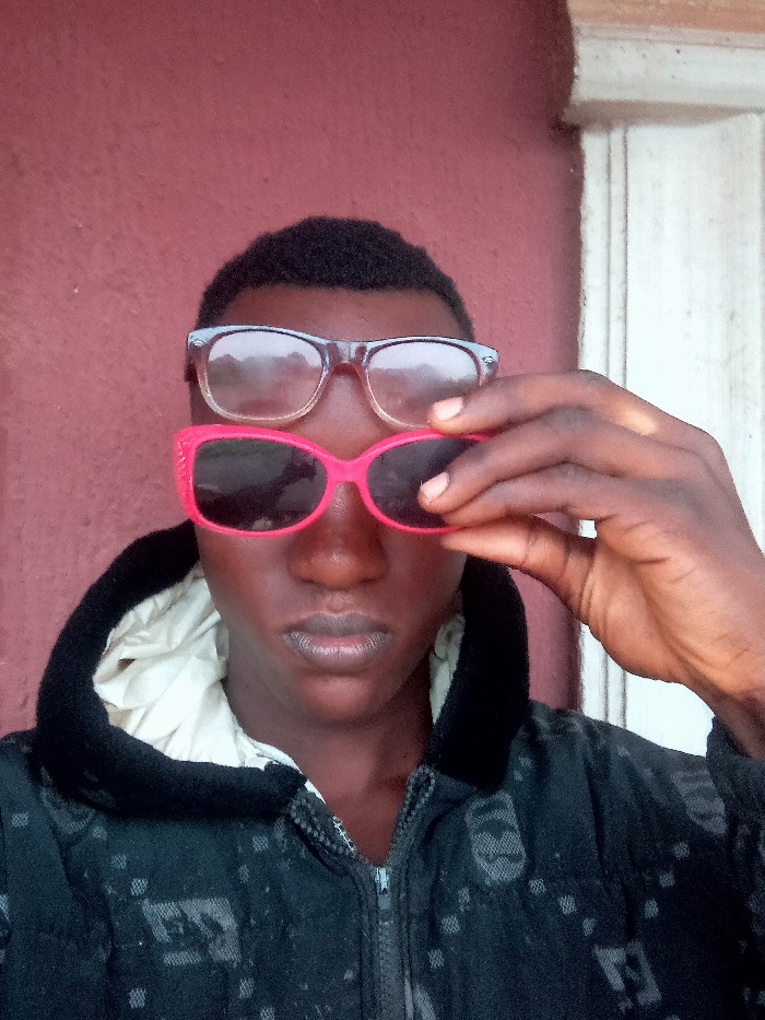 The image displays a close-up, head-and-torso portrait of a young individual, likely male, against an indoor or sheltered outdoor background in Asaba, Nigeria. The subject has dark skin, short black hair, and is looking directly at the camera with a neutral expression. They are wearing a dark, possibly black, zippered hooded jacket with a subtle grey patterned design, over a visible light-colored inner layer. Two pairs of glasses are featured: a pair of clear-lensed eyeglasses with light-colored frames rests on the subject's forehead/hairline, while a pair of red-framed sunglasses with dark lenses is held over their eyes by their right hand. The background consists primarily of a plain reddish-brown wall on the left, with a partial view of a lighter-colored, vertically paneled or grooved structure, resembling a doorframe, visible on the right side of the frame. The scene is illuminated by natural light.