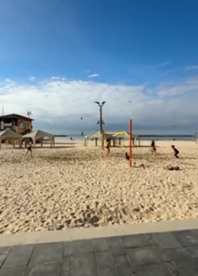 A wide shot captures a sunlit beach under a blue sky with scattered clouds. The sandy beach is the focal point, showing multiple groups of people playing volleyball near white canopies. A lifeguard station is visible in the left background. The camera remains static, and the scene suggests a leisurely beach atmosphere.