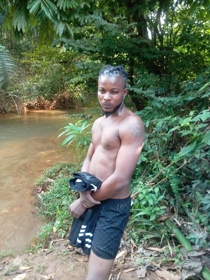 An adult male stands shirtless on a dirt bank next to a body of water in a natural, heavily vegetated environment. The individual, appearing to be of African descent, has a muscular build, dreadlocks or braids with shaved sides, a trimmed beard, and a small hoop earring in his left ear. A dark tattoo is visible on his upper left arm. He is wearing dark patterned shorts and holds a black garment with white markings in his left arm. He faces forward, looking directly at the camera. To his left, a murky brown river or stream flows past a bank covered in green foliage. The background consists of dense, lush green trees and undergrowth. The scene is located in Igbenu, Nigeria.