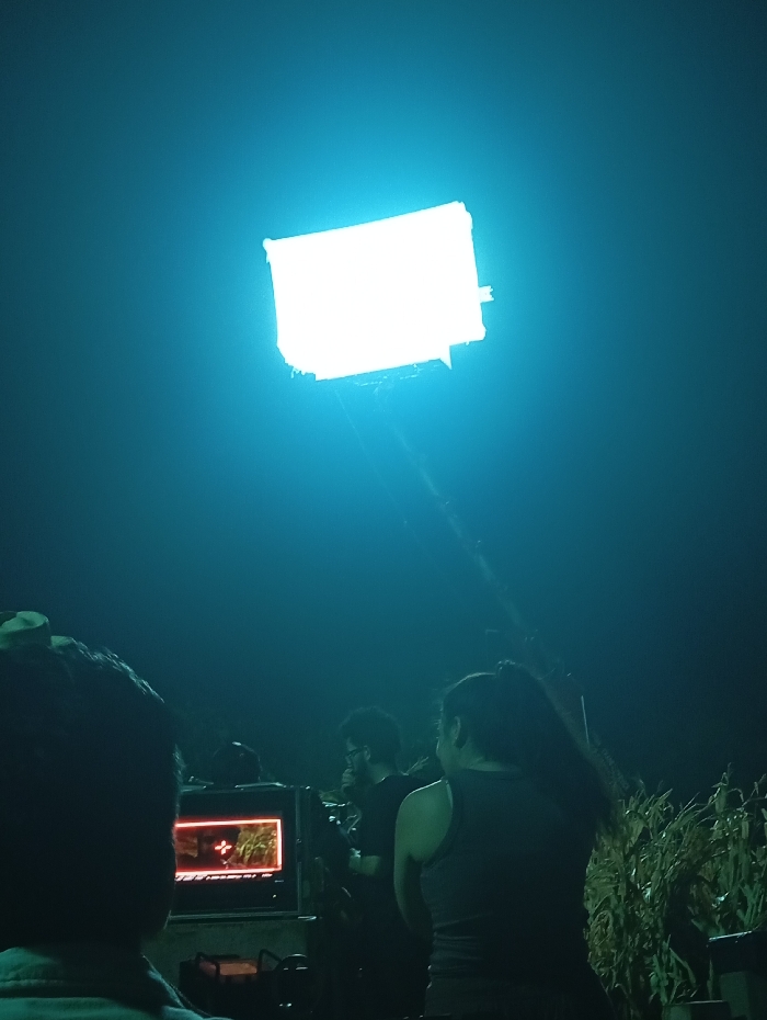 The image depicts an outdoor night scene illuminated by artificial light, set in Mumbai, India. A large, rectangular, intensely bright white light panel is positioned high above, casting a pervasive blue-green ambient light over the scene. In the mid-ground, three individuals are present. A person with dark, curly hair and glasses, wearing a dark shirt, stands centrally, holding a microphone or similar object near their mouth, facing towards the right. To their right, the back of a person with long, dark hair tied in a ponytail, wearing a dark sleeveless top, is visible, facing the person with the microphone. In the immediate foreground, the out-of-focus back of a third person's head and left shoulder, wearing a collared garment, occupies the lower-left corner. To the left of the person holding the microphone, a video monitor displays an image, possibly a camera feed, showing a dark environment with reddish-orange elements and a crosshair-like overlay. Dark, indistinct production equipment is visible beneath and around the monitor. To the far right of the frame, tall, leafy green vegetation, resembling corn stalks or similar crops, rises from the ground. The overall setup indicates an active film or video production.