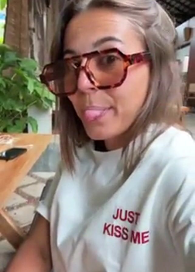 woman wearing large, octagonal tortoise-shell glasses and a white t-shirt with the words "JUST KISS ME" in red letters. The woman is sitting at a wooden table in an open-air environment with greenery visible in the background. The setting appears to be outdoors or a semi-enclosed space with a rustic, possibly tropical ambiance. The woman looks at the camera with a slight smile.