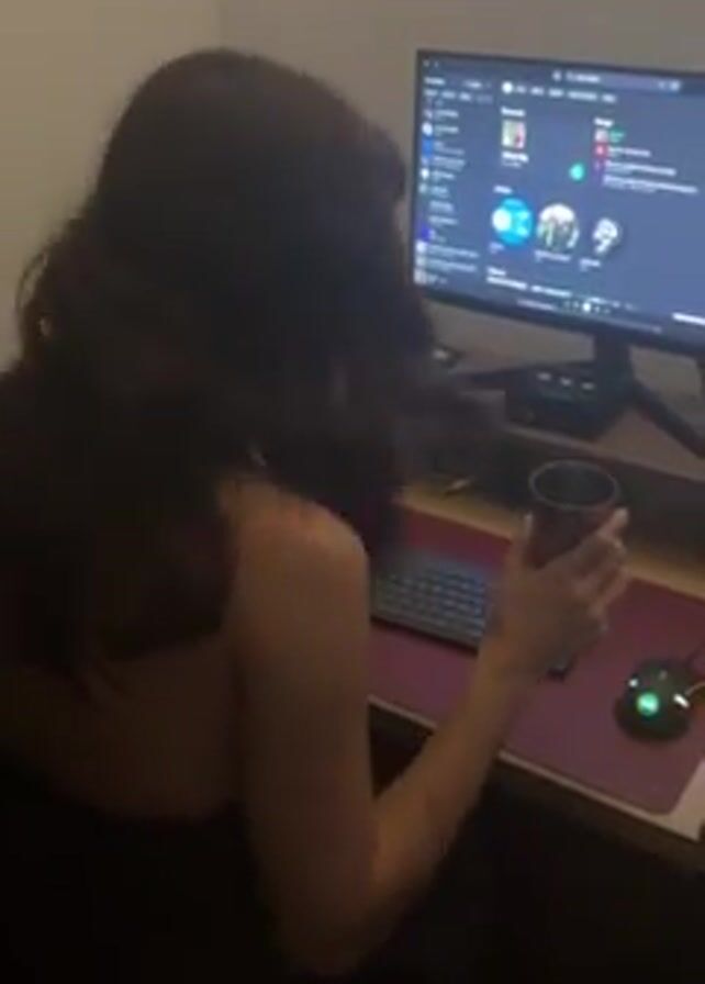 A woman with long brown hair stands facing a computer. She is wearing a black top and holding a silver cup in her left hand. The computer monitor displays a screen with icons. The desk is wood and has a keyboard, mouse, and a mousepad. The mouse has colored lights. A device sits under the monitor. The room is simple with a white wall. The camera slightly shakes at times. Loud music plays in the background.