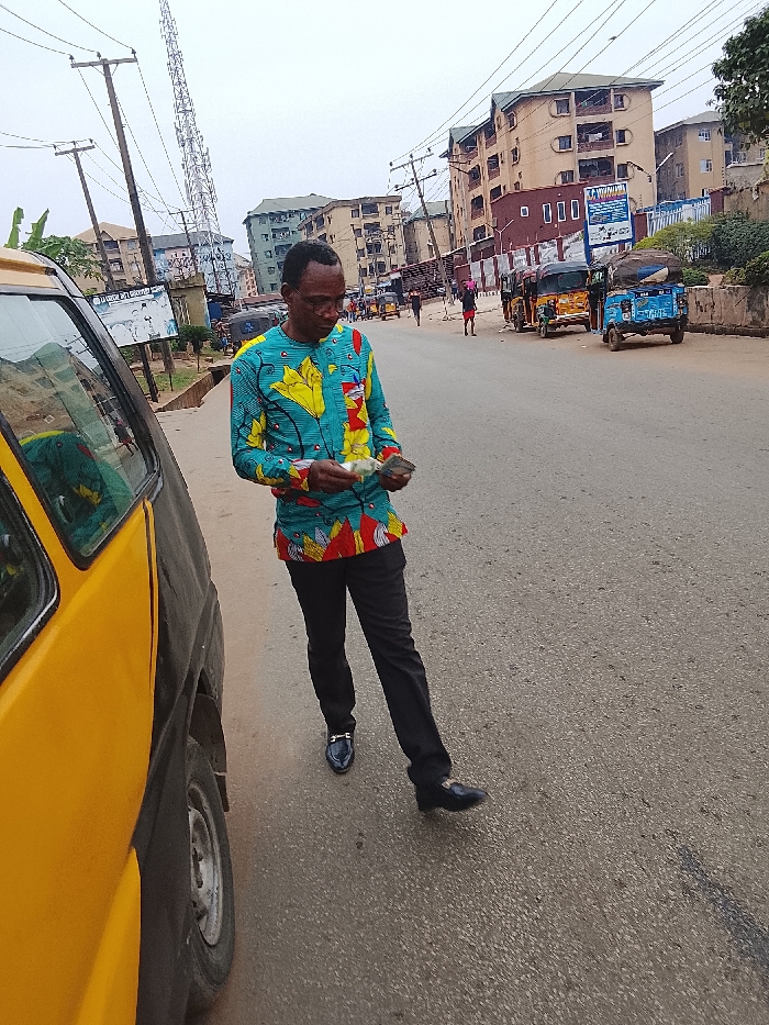 The scene depicts a street in Onitsha, Nigeria, under an overcast sky. In the foreground, a dark-skinned male, wearing glasses, a long-sleeved patterned shirt featuring teal, yellow, red, and black designs, black trousers, and black loafers with gold buckles, stands on an asphalt road. He holds and appears to count several Nigerian naira banknotes in his left hand. To his immediate left, the yellow side panel and a tire of a vehicle are partially visible. The asphalt road recedes into the background, where multiple multi-story concrete buildings line both sides. Utility poles with overhead wires are prominent throughout the urban landscape. A tall metal lattice communication tower is visible in the mid-background. On the right side of the road, several tricycle auto-rickshaws ("Keke Napep") are parked or stationary, and a blue billboard is partially visible. Additional pedestrians are discernible in the distance on the right side of the road.