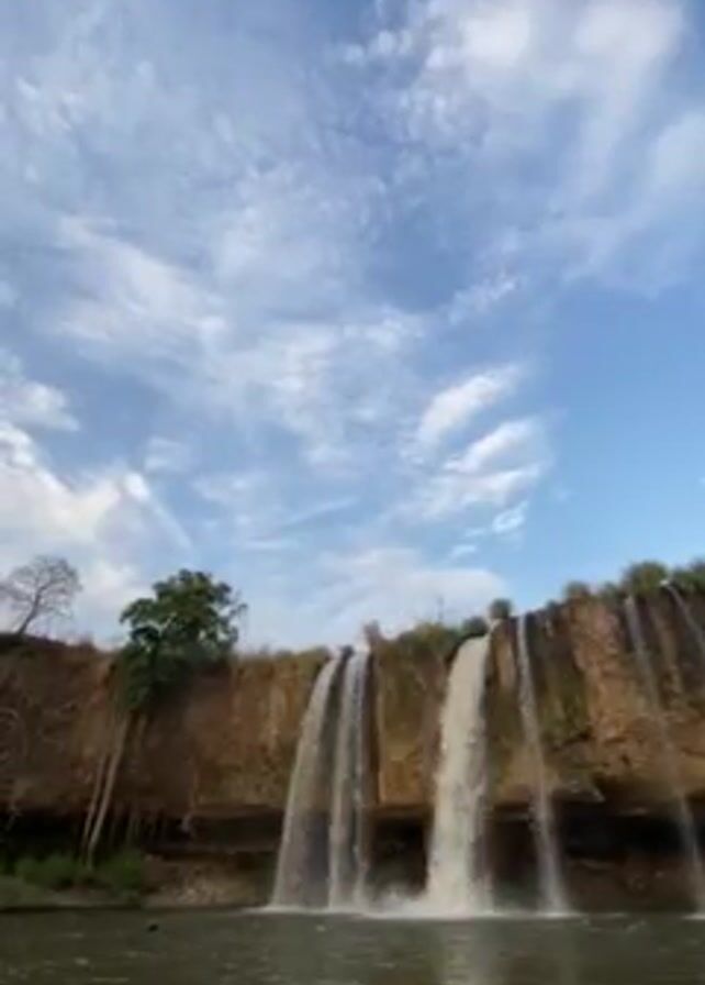 waterfall with multiple streams of water cascading over a rocky cliff into a body of water. The sky is blue with scattered white clouds. There is some sparse vegetation on top of the cliff and a few trees to the left of the falls. The water in the pool below appears somewhat murky. The camera is stationary and captures a wide view of the scene.