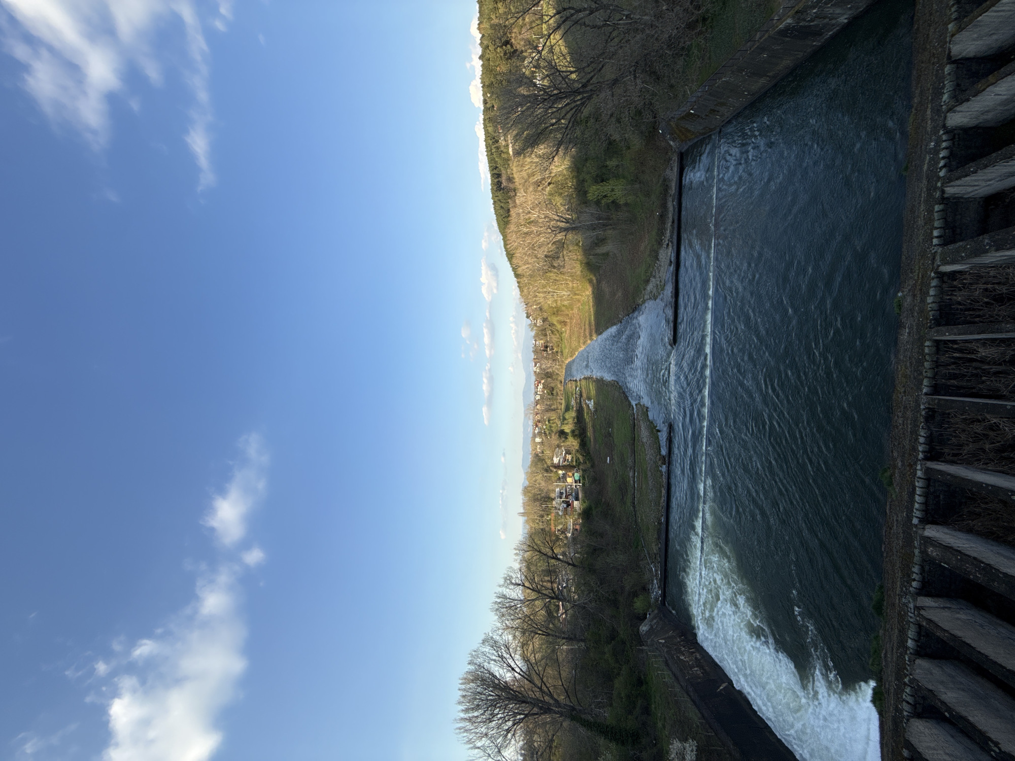 dam and spillway in Pancharevo, Bulgaria. The water is flowing over the dam into a canal that runs through a valley with trees and houses. The sky is blue with some clouds. The structure of the dam is visible, with concrete steps and walls.