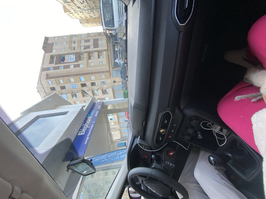 The image captures an urban street scene in Meknes, Morocco, from the front passenger seat of a modern vehicle, likely a Dacia given the steering wheel emblem. The driver's arm, clad in white long sleeves, and their leg in white pants are visible on the left, with hands on the steering wheel of a manual transmission car. In the immediate foreground, the passenger's legs, covered in bright pink pants, are visible, with a small, light-colored dog resting on their lap. A white charging cable is plugged into the center console and extends towards the passenger. Outside the vehicle, an "Éléphant Bleu" car wash facility is centrally positioned, identifiable by its blue sign displaying "Éléphant Bleu," "Lavage Haute Pression," and "24h/24 7j/7." The car wash structure features a contemporary design with concrete elements and a prominent upper-level glass window. Behind the car wash, a tall, multi-story residential building with a beige facade, numerous windows, and balconies (some displaying hanging laundry) dominates the background. Further down the street to the right, other similar multi-story buildings are visible. The street itself contains various parked or slowly moving vehicles, including a white Mercedes-Benz Sprinter-type commercial van in the right foreground and several sedans. A green trash receptacle is visible on the sidewalk. The location is an Éléphant Bleu car wash on Boulevard Allal Ben Abdellah in Meknes, Morocco.