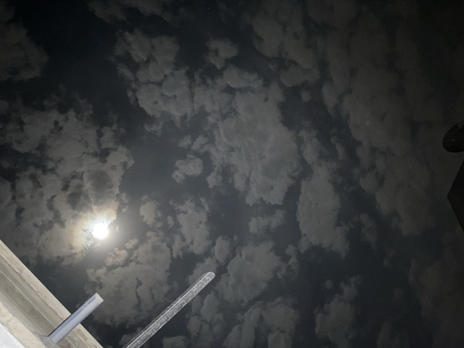 The image captures a nighttime view over Khan Yunis, Palestinian Territory. The sky is largely covered with scattered, illuminated cumulus clouds, with a bright, nearly full moon visible through a break in the clouds in the upper-left quadrant. From the top-left, a concrete architectural element overhangs the scene. Protruding from this structure are two light-colored, cylindrical objects: a shorter, wider pipe extending diagonally downwards and right, and a longer, thinner rod extending further into the frame, also downwards and right. In the bottom-right corner, a dark, angular rooftop structure and a dark, partially visible, dome-shaped object, consistent with a satellite dish, are silhouetted against the cloudy sky. No individuals are present in the static scene.