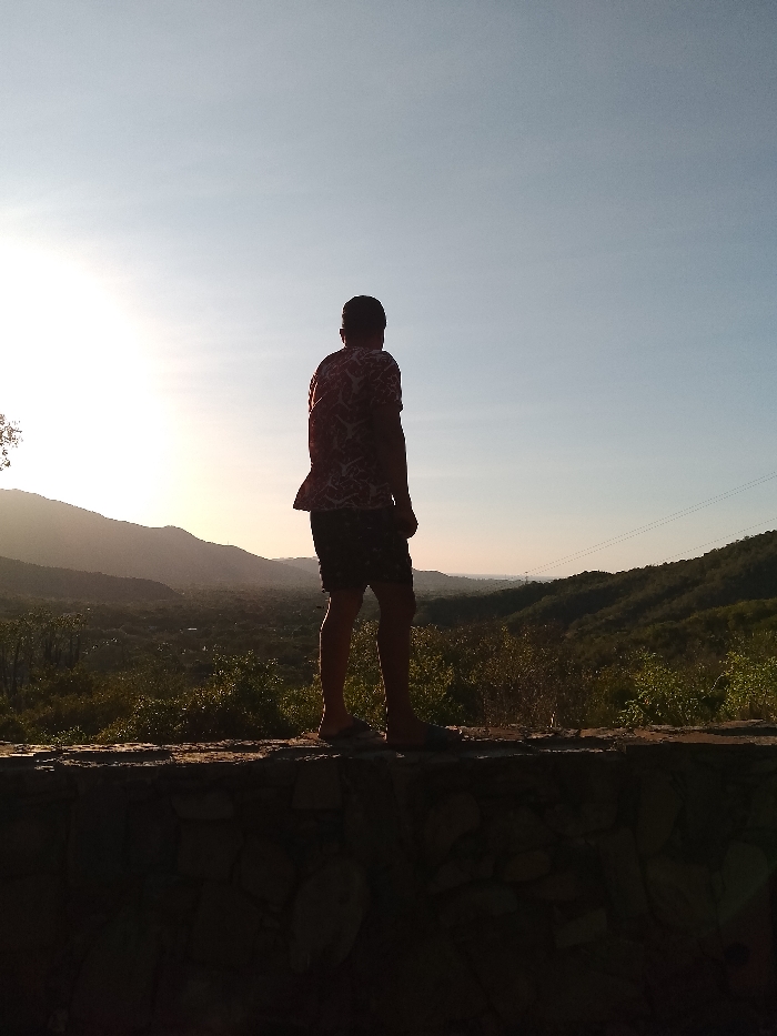 A male individual stands in silhouette on a stone wall overlooking a vast natural landscape in Tacarigua, Venezuela