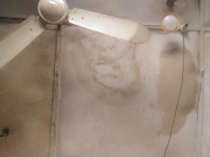 The image depicts an indoor wall and ceiling section, likely within a building in Unknown, Unknown. The primary background is a light-colored, possibly painted, wall or ceiling exhibiting extensive brown and beige water damage or staining, particularly a large, irregular pattern in the upper center and a vertical streak on the right. A three-bladed ceiling fan, off-white in color, is partially visible in the upper left corner, attached to the ceiling and appearing stationary. In the upper right corner, a wall-mounted light fixture features a spherical white bulb housed within a yellow or off-white circular casing. A thin, dark electrical cable descends vertically from this light fixture, running across the stained wall surface. A vertical structural element or seam, showing signs of wear and possibly peeling paint, runs down the center-left of the image, separating a slightly darker panel on the far left. No individuals or specific actions are depicted.