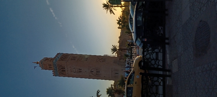 A tall minaret stands prominently against a clear blue sky that transitions into an orange hue near the horizon. Palm trees are visible in the background, adding to the scene's exotic ambiance. A line of parked cars and a decorative metal fence run alongside the building, suggesting an urban setting. The sun is setting, casting long shadows and creating a warm, golden light on the architecture.