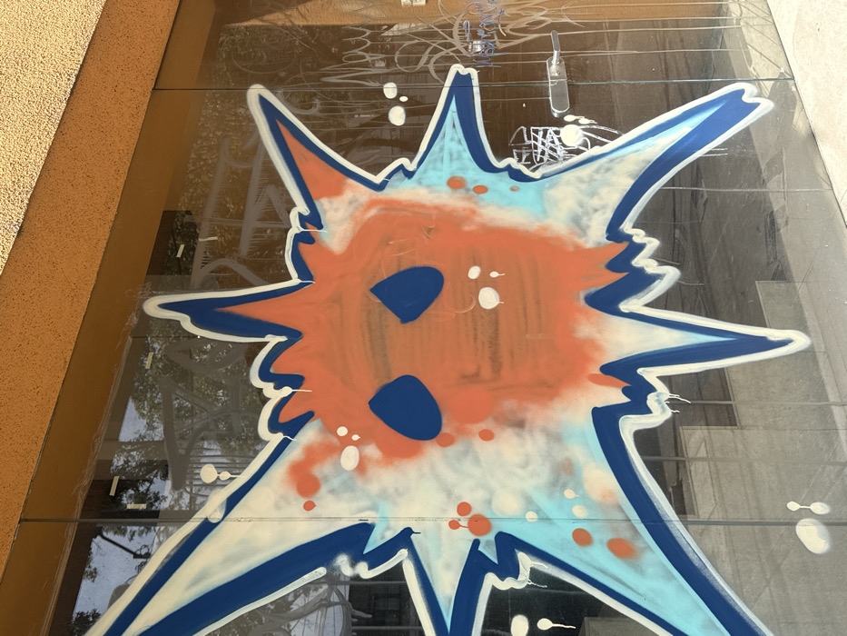 The image displays a multi-layered graffiti artwork spray-painted across a large, reflective glass storefront window in Mexico City, Mexico. The primary graffiti piece is a jagged, starburst-shaped design, approximately centered in the frame. This design features an inner orange area depicting a cartoonish face with two dark blue almond-shaped eyes and two smaller circular dark blue features below them, resembling a nose or mouth. This orange central area transitions outwards to lighter blue and white sections, all outlined in a prominent dark blue. Drips of paint are visible in orange, white, and light blue. The glass surface beneath and around this main artwork is covered with numerous smaller, white and grey graffiti tags and handwritten scrawls. Reflections on the glass reveal urban elements, including green foliage from trees and architectural structures from across a street or plaza. Above the glass panels, a textured, rough orange-brown building wall spans horizontally across the top of the image. The scene is illuminated by direct sunlight. No individuals are present in the frame.